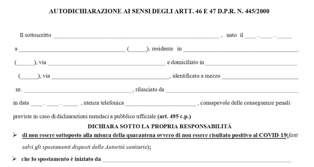 Sarà però obbligatorio per chi deve andare fuori dalla propria regione. Gli spostamenti sono consentiti soltanto per tre motivi, che devono essere indicati: lavoro, necessità e urgenza, salute.