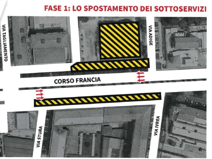 La prima fase riguarderà lo spostamento dei sottoservizi, quali acqua, luce, gas, telefonia, in un arco temporale di circa sei mesi, tramite cantieri posti sui controviali di C.so Francia e Piazza Togliatti. Durante questa prima fase potranno essere introdotti eventuali restringimenti sulle carreggiate centrali, su cui però sarà sempre garantito il transito.