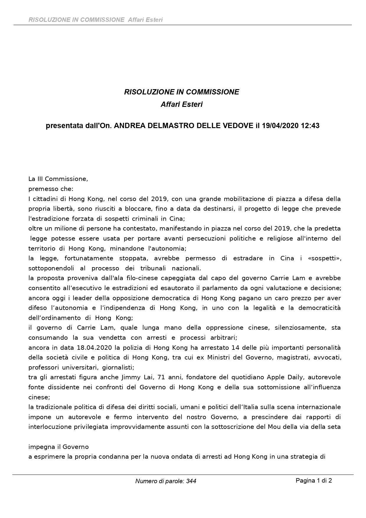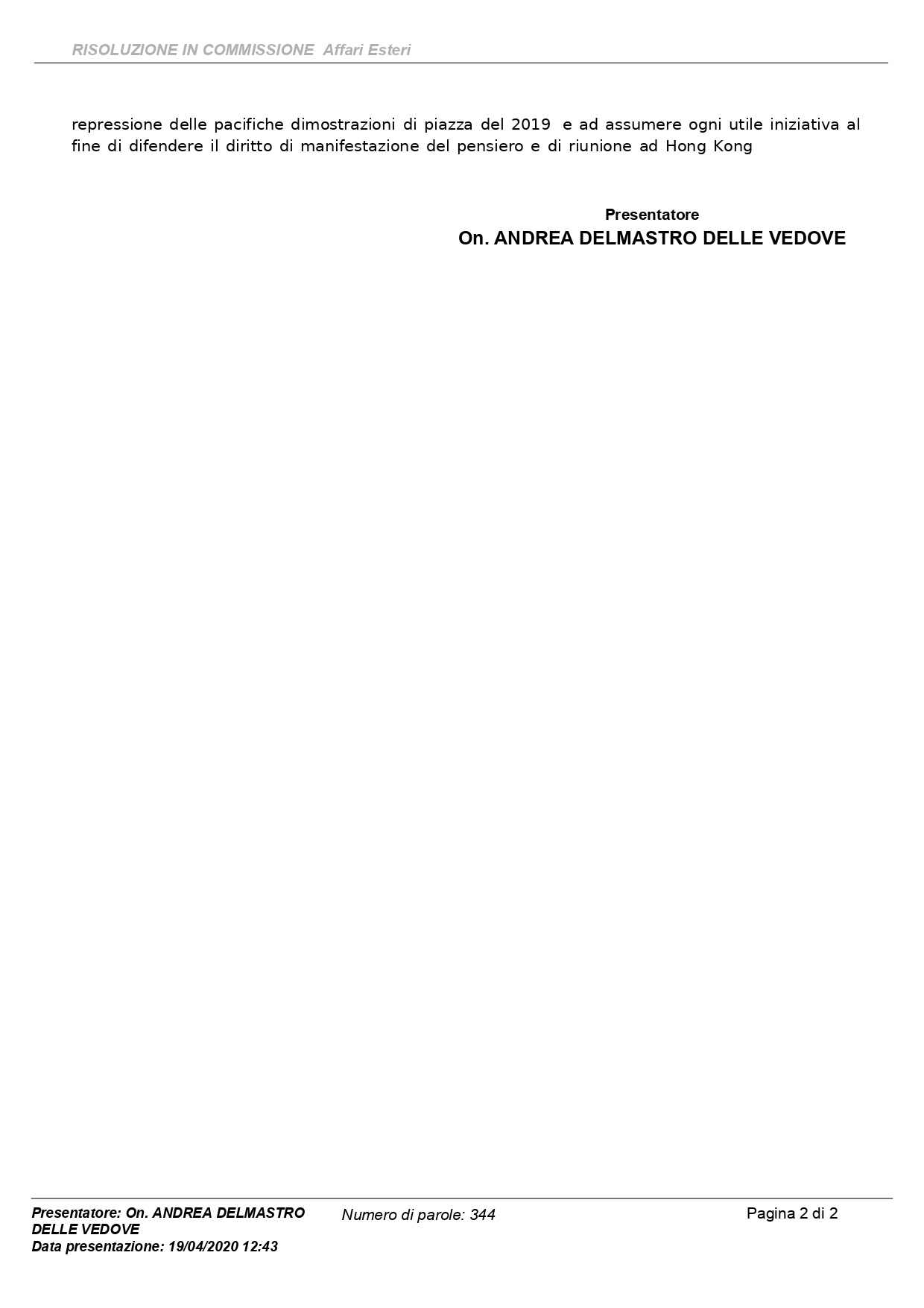 Continua Delmastro: “Ho depositato oggi in commissione Esteri una risoluzione perchè l’Italia condanni fermamente la repressione cinese ad Hong Kong: l’improvvida sottoscrizione della via della Seta non si trasformi in via della sottomissione. L’Italia non può in alcun modo essere silenziosa complice delle repressioni cinesi nel mondo: democrazia, libertà, diritti politici e umani non sono oggetto di compromessi”.