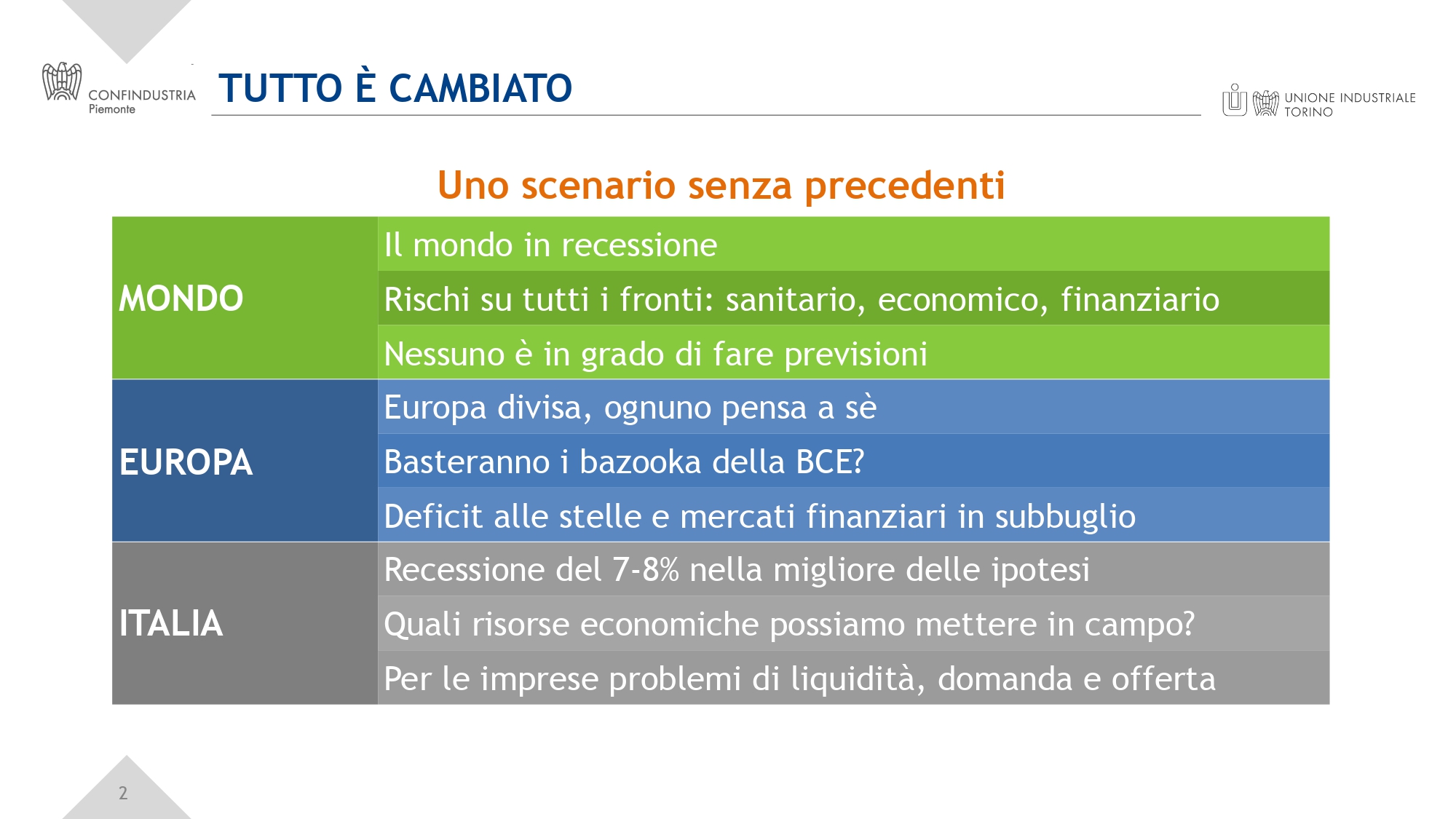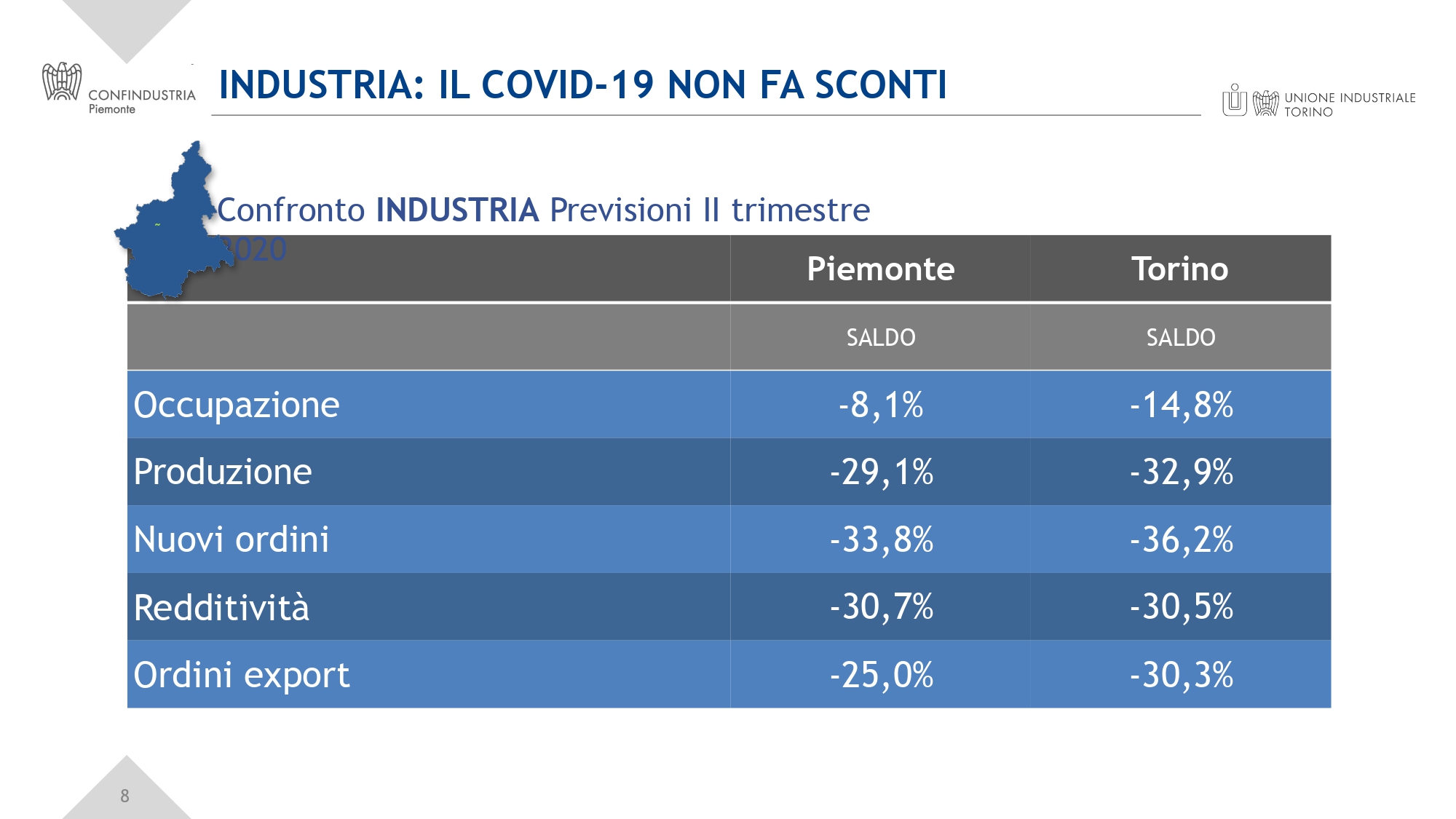 “L’epidemia ha colpito il nostro Paese in un momento difficile – commenta il Presidente dell’Unione Industriale di Torino, Dario Gallina. Eravamo già in recessione, con modeste prospettive di rilancio e un deficit elevato; alla debole dinamica degli investimenti produttivi si aggiungeva la situazione di crisi strutturale di comparti importanti, a partire dall’automotive, in mezzo al guado di un complesso processo di transizione tecnologica. Il blocco delle attività rischia di essere letale per interi settori produttivi e tipologie di aziende. Nessuna impresa, per quanto solida e ben patrimonializzata, può permettersi uno stop prolungato. Confindustria sostiene con forza che è necessario e possibile ripartire al più presto. L’obiettivo, primario e irrinunciabile, di tutelare la salute dei lavoratori, è pienamente conciliabile con quello di riaprire le fabbriche”.