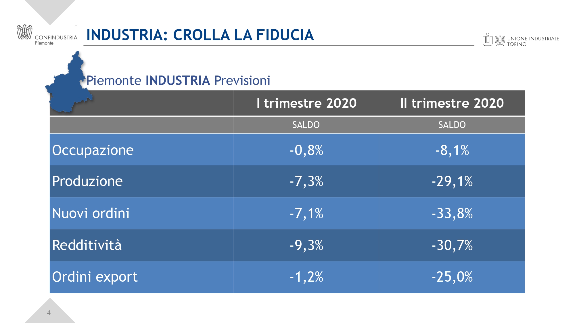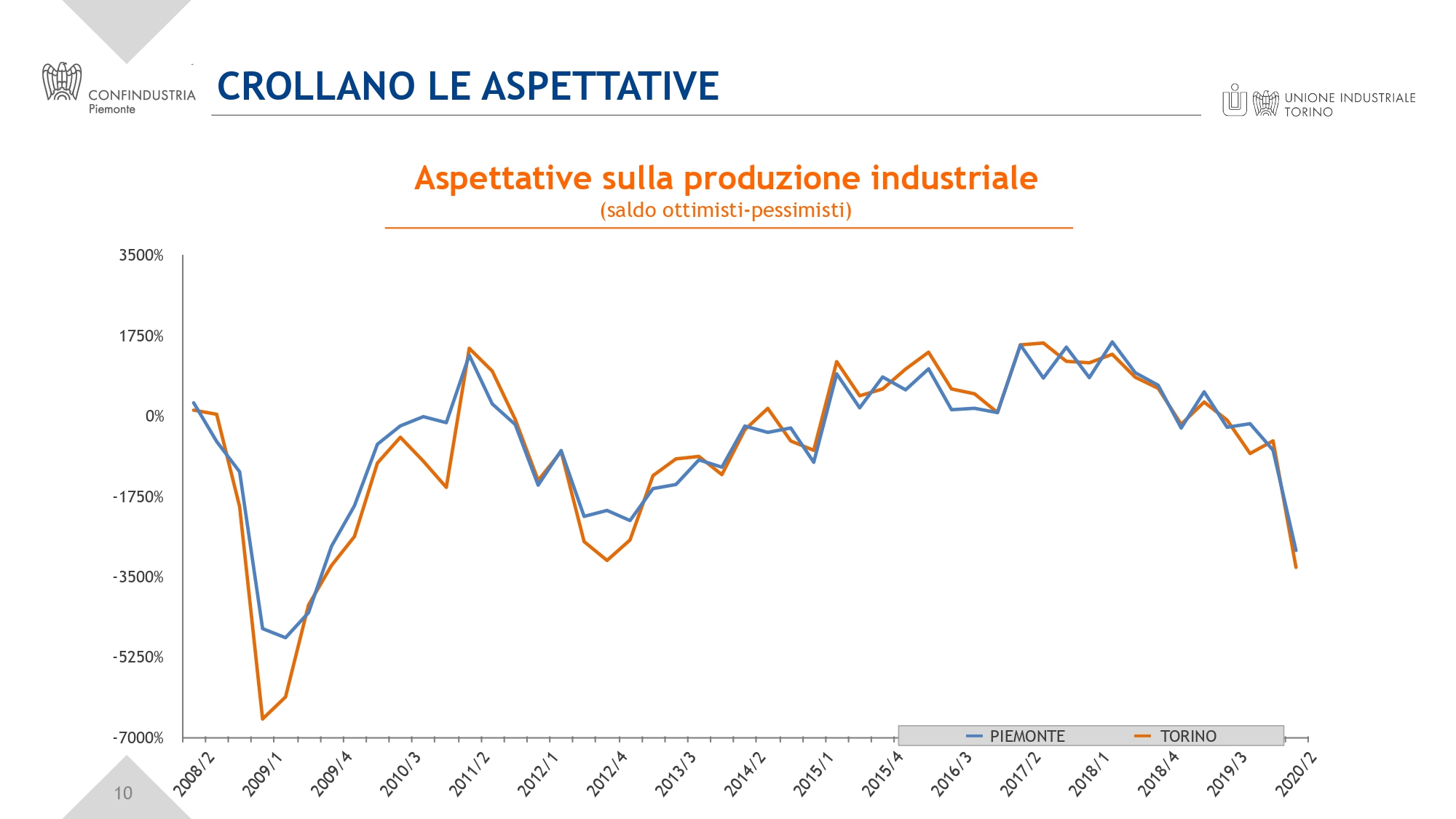 “Il nostro sondaggio di marzo – commenta Fabio Ravanelli, Presidente di Confindustria Piemonte – riflette puntualmente la gravità della crisi e i timori per il futuro del nostro sistema produttivo. Indicazioni che trovano conferma nei dati e nelle previsioni, molto preoccupanti, su produzione industriale, Pil, consumi, export. Una crisi molto diversa, per natura e implicazioni, dalla “grande recessione” del 2008-2009, che pure ha avuto costi altissimi. Oggi è a rischio la tenuta economica e sociale del nostro Paese, non solo qualche punto di Pil. Dobbiamo mettere in campo, insieme alla BCE e all’Europa, tutte le risorse disponibili per sostenere la liquidità delle imprese, aiutare le famiglie, mantenere la continuità delle filiere”.