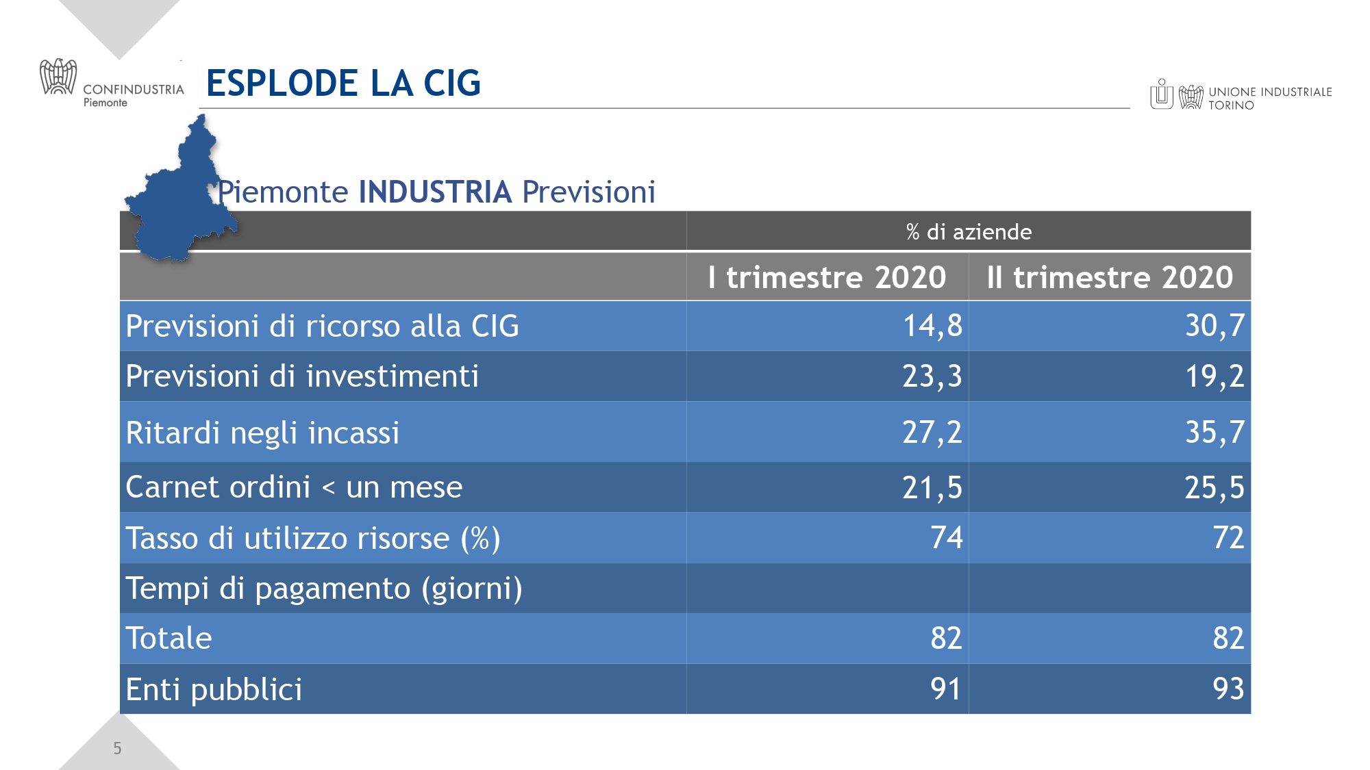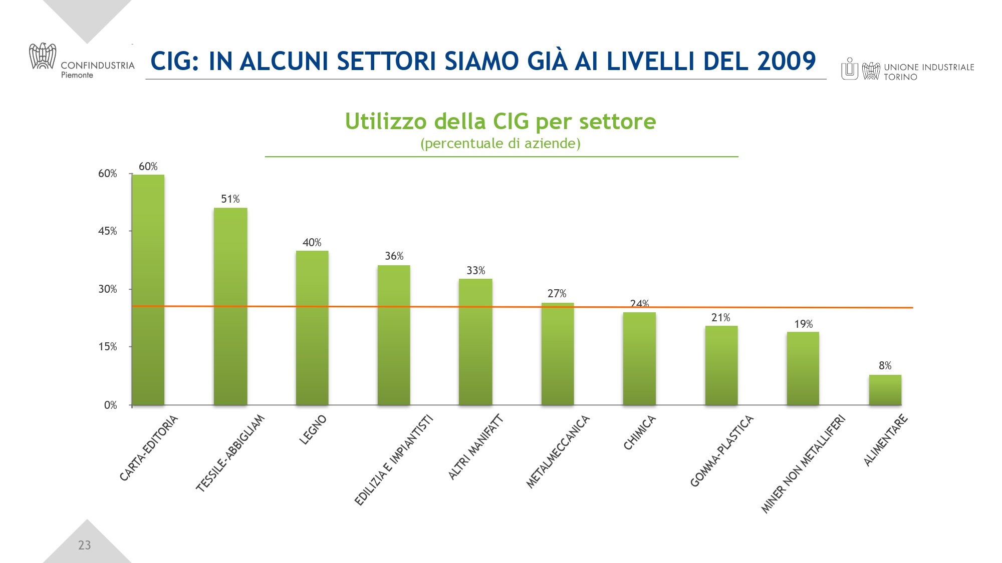 Ancora più drammatiche le previsioni sugli ordinativi: il 50% sconta una contrazione (contro l’11%). Era dal 2009, anno di picco della crisi scoppiata nel 2008, che non si registravano valori così negativi per produzione e ordini. Crollano anche export e redditività. Aumentano i ritardi nei pagamenti – un indicatore molto sensibile alle fasi di brusco deterioramento del mercato. Si impenna il ricorso alla CIG: quasi un terzo delle aziende prevede di essere obbligata a fare ricorso agli ammortizzatori sociali. Percentuali così elevate non si vedevano dal 2012-2013.