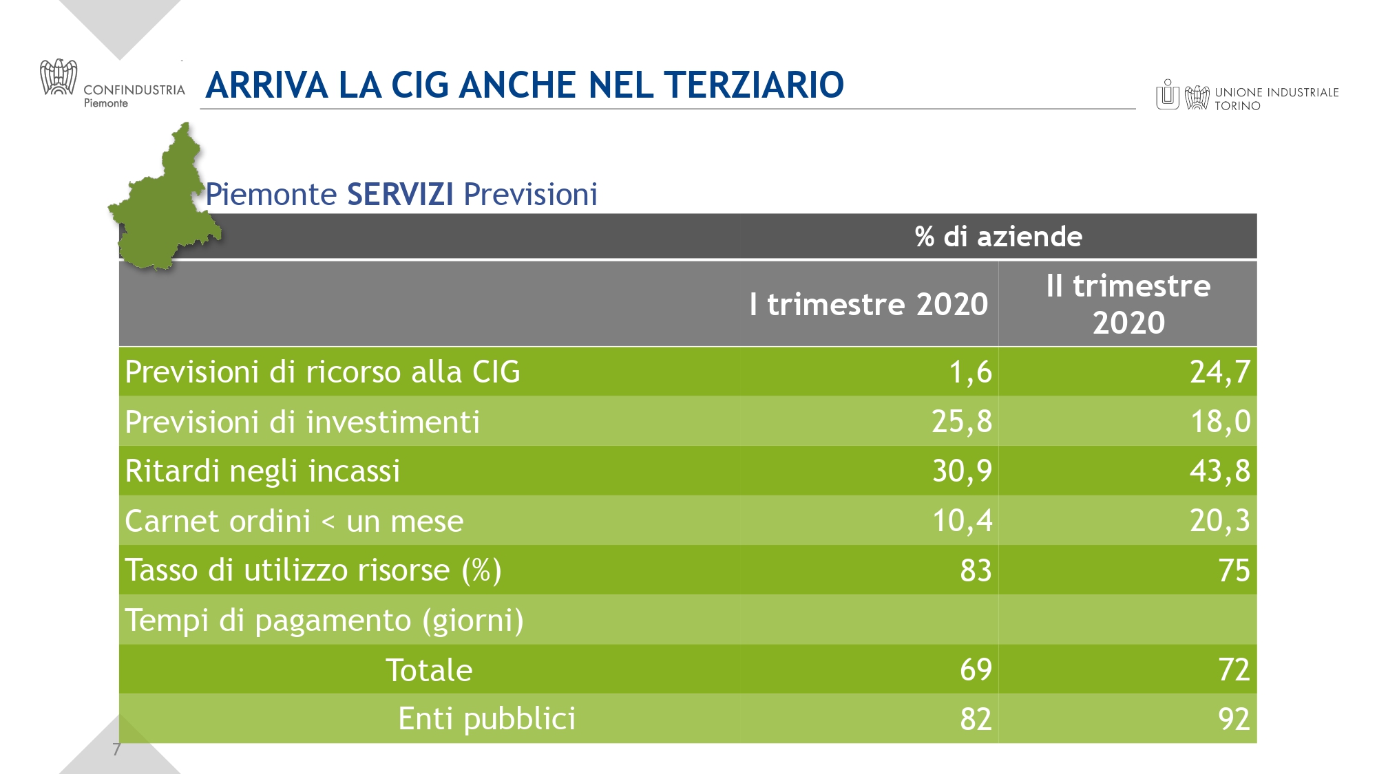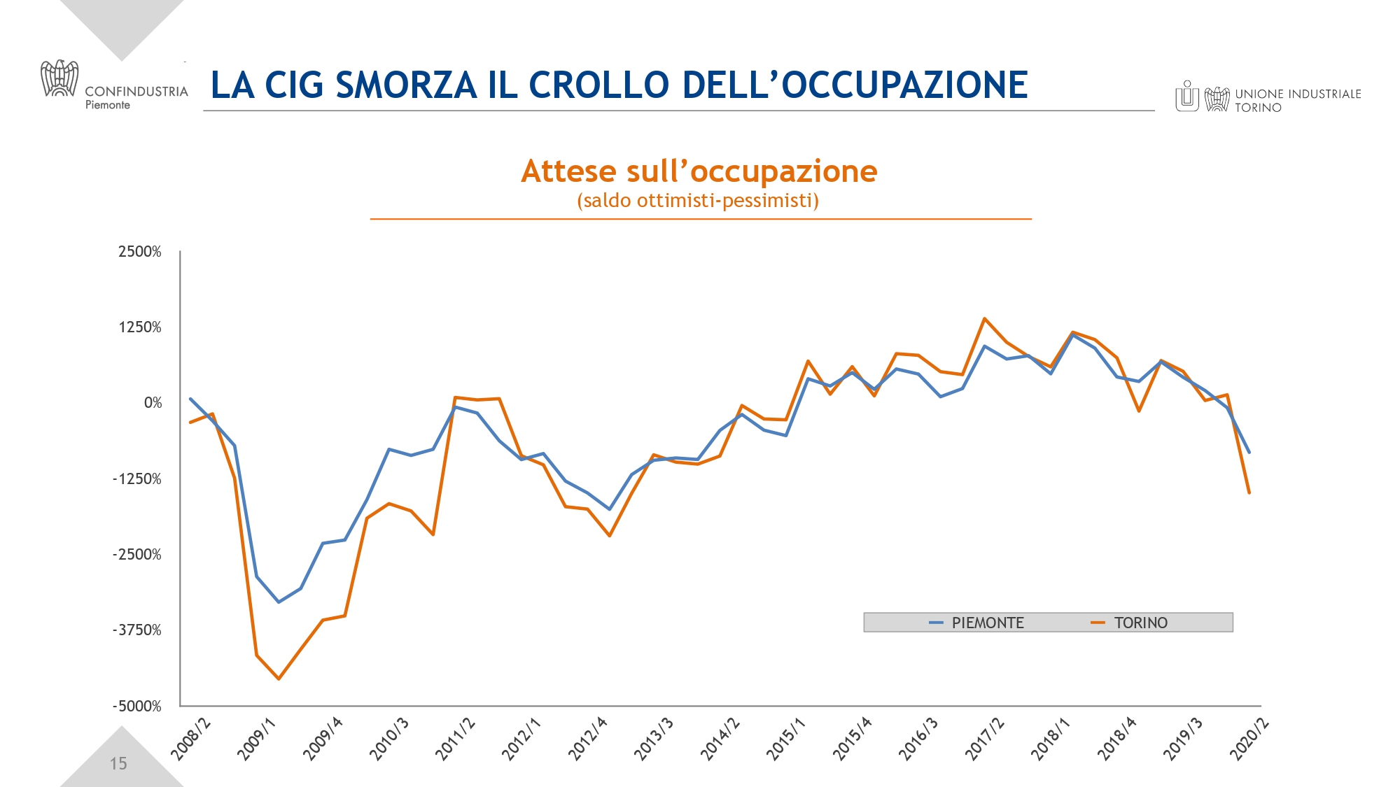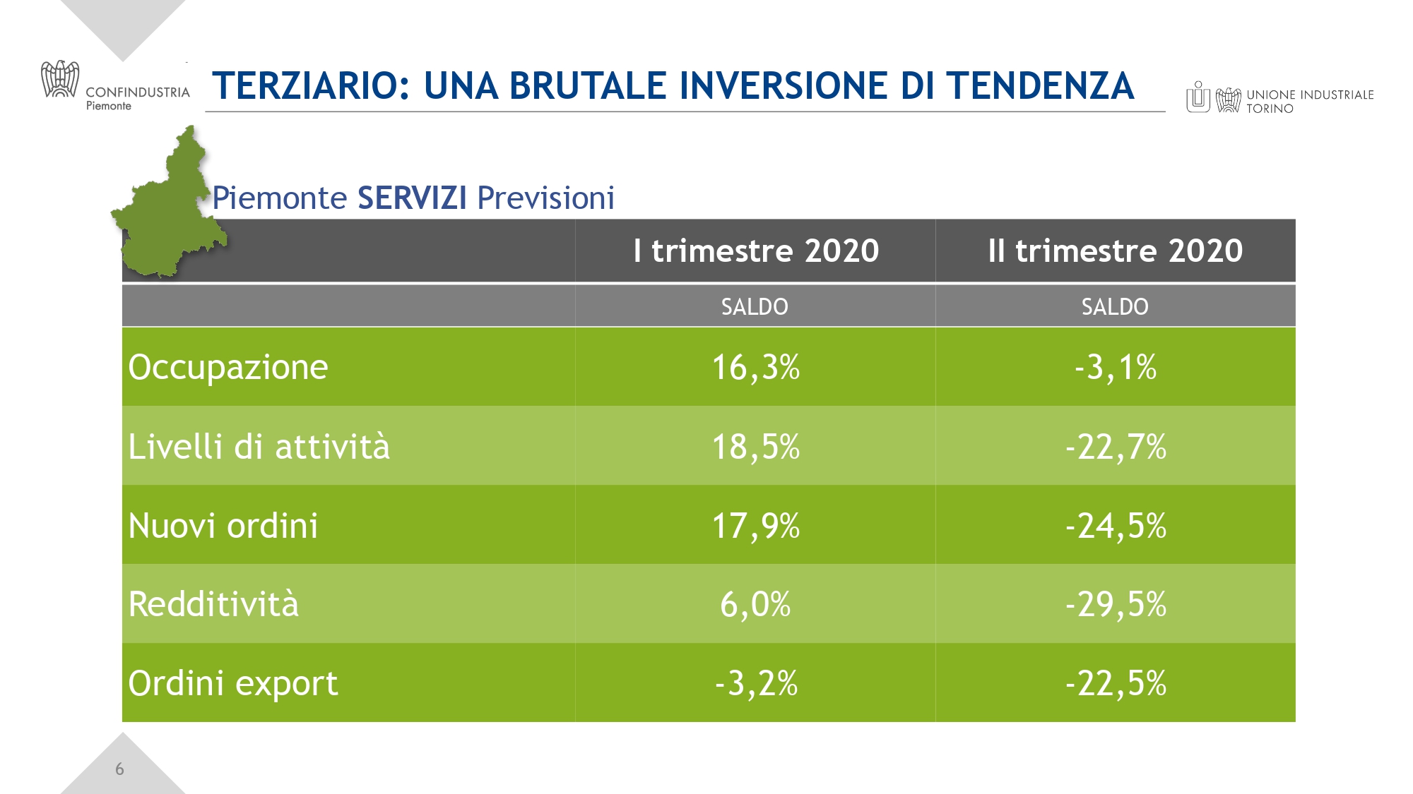 Le oltre 300 aziende del campione esprimono la gelata che si è abbattuta sul terziario piemontese e non solo, con l’epidemia di Covid-19: i saldi passano da una doppia cifra positiva a una doppia cifra negativa. In particolare, il saldo ottimisti-pessimisti sui livelli di attività passa da +18,5% a -22,7%. Quello ordini totali passa da +17,9% a -24,5%. Il saldo sull’occupazione, un po’ meno drammatico, passa da +16,3% a -3,1%.