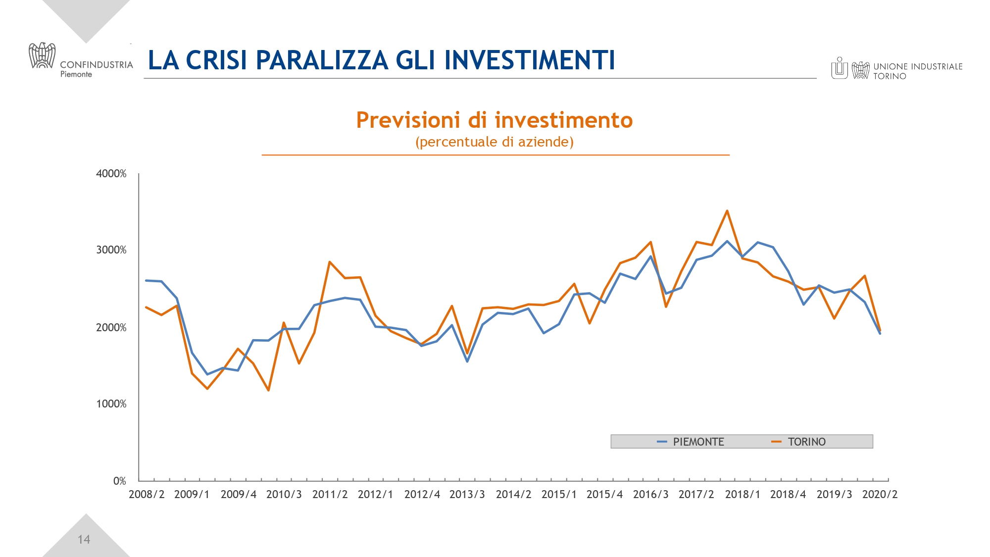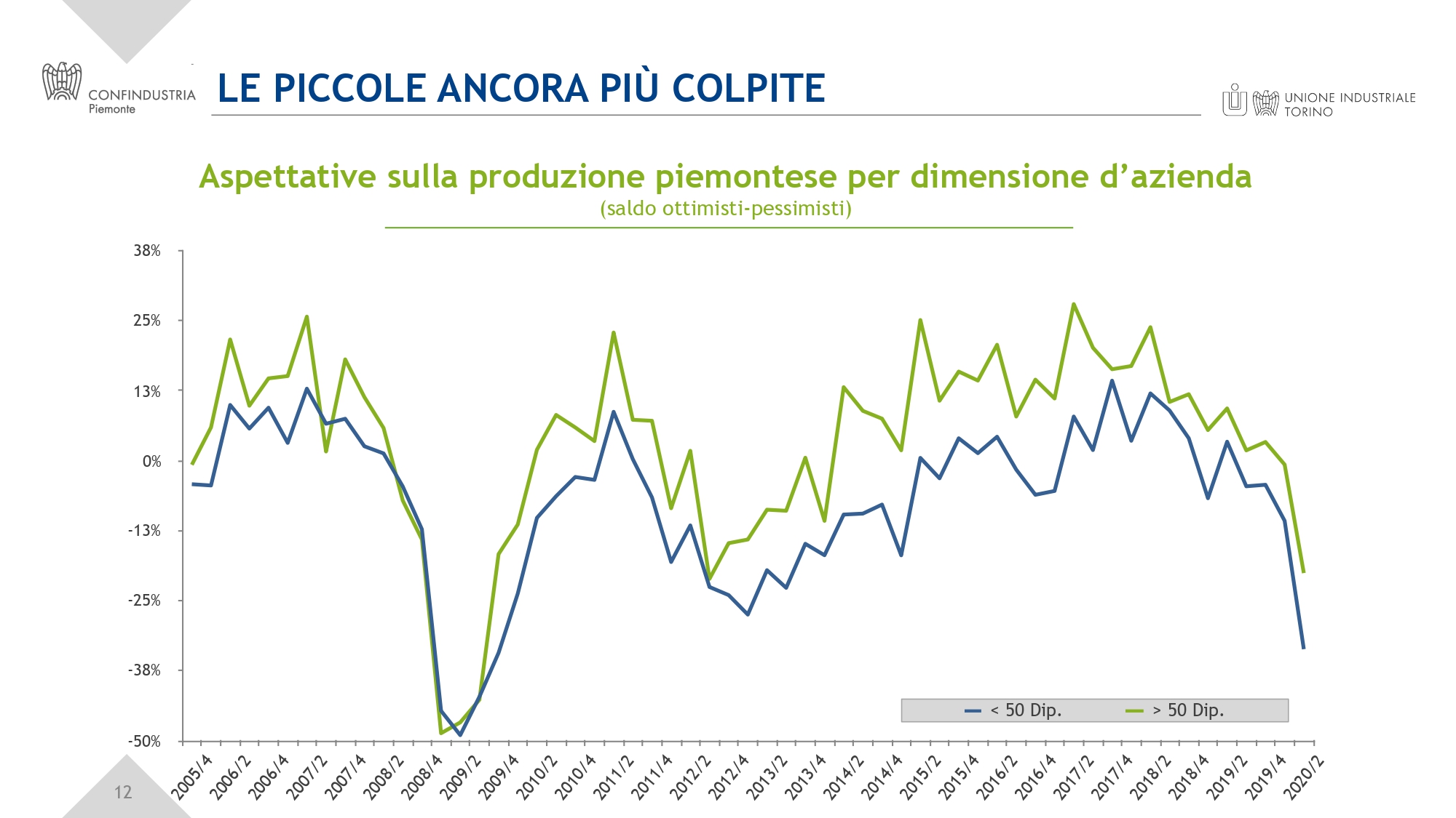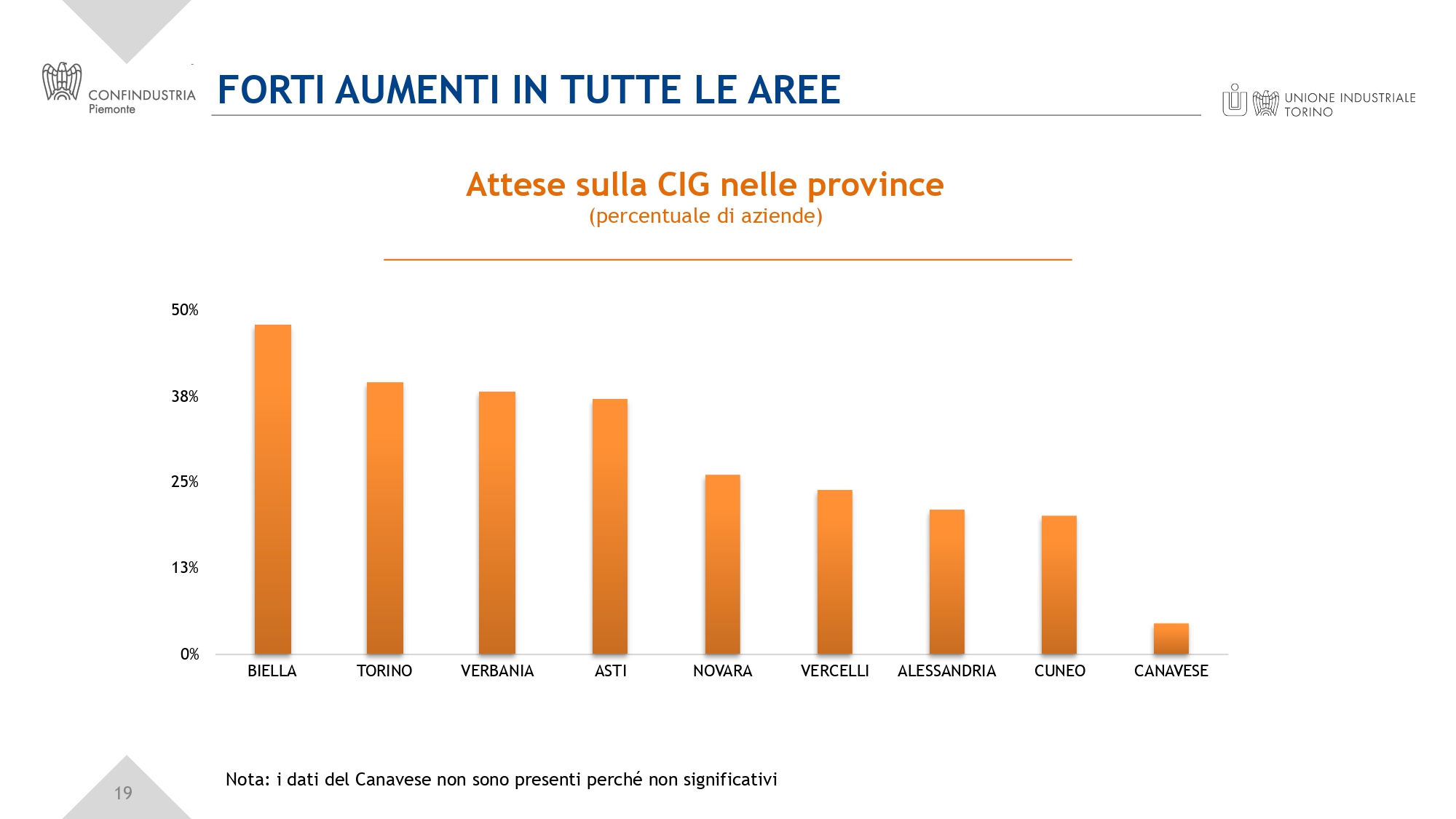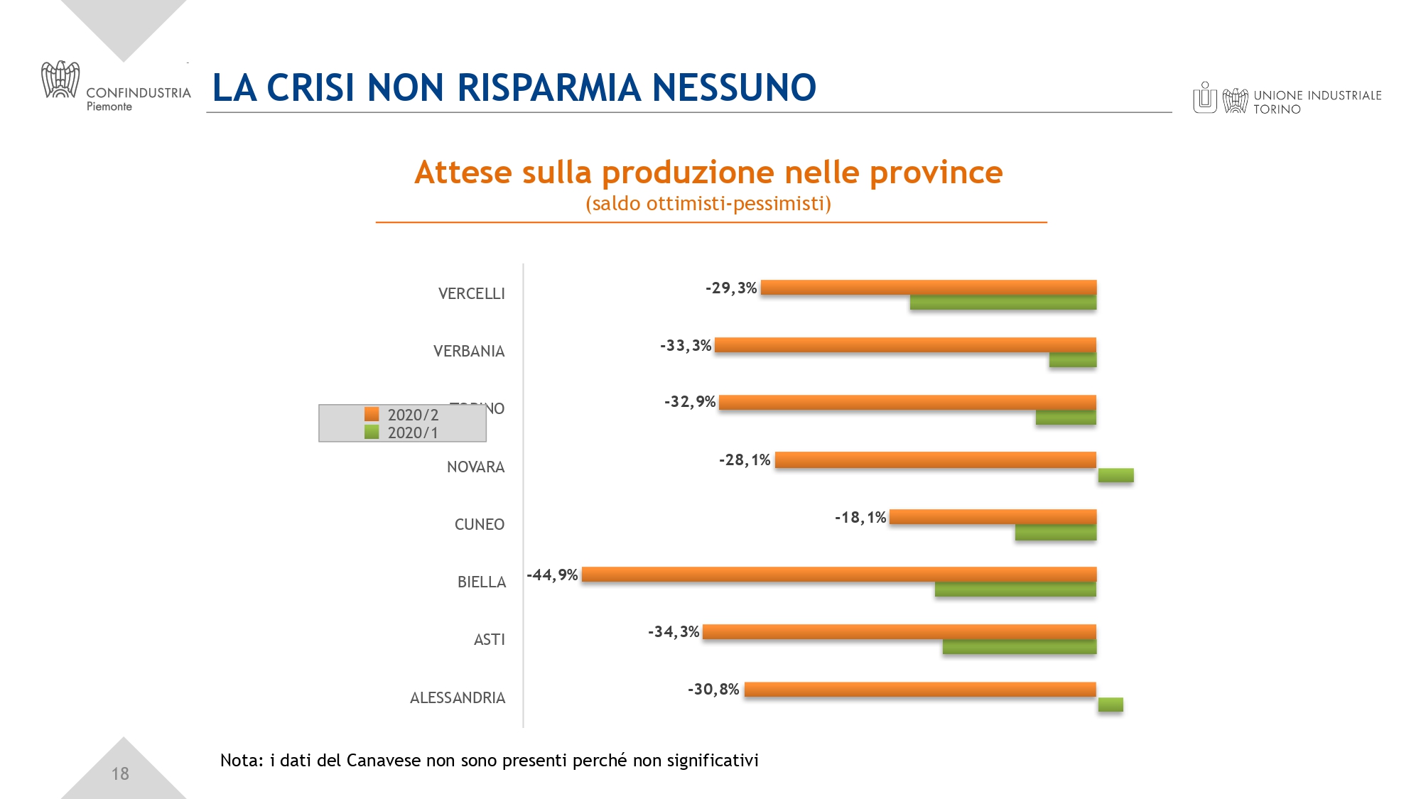 A livello territoriale, il clima di fiducia peggiora uniformemente in tutte le aree del Piemonte. A soffrire di più è la provincia di Biella (-44,4%), anche a causa della crisi del tessile iniziata ben prima del coronavirus. Seguono Asti, Verbania e Torino (rispettivamente -34,3%, -33,3% e -32,9%). Alessandria registra un saldo del -30,8%, Vercelli e Novara rispettivamente del -29,3% e -28,1%. A Cuneo il saldo è pari a -18,1%, meno peggio che nelle altre province, grazie alla tenuta del settore agro-alimentare. Non significativa la rilevazione per il Canavese, dove le risposte sono poche e tutte antecedenti la chiusura delle attività.