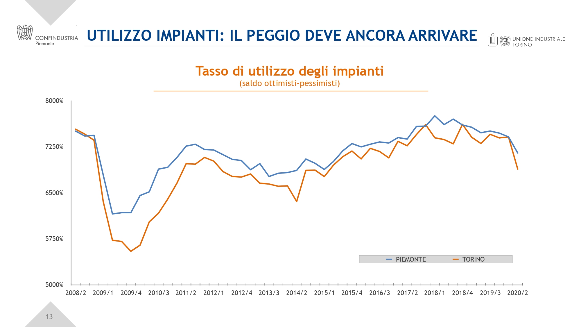 Comprensibilmente si riducono le aziende con programmi di investimento di un certo impegno, che passano dal 23,3% al 19,2. Per ora il tasso di utilizzo della capacità produttiva registra un leggero calo (72% un valore appena al di sotto della media pre-crisi) che probabilmente si accentuerà nel prossimo trimestre.