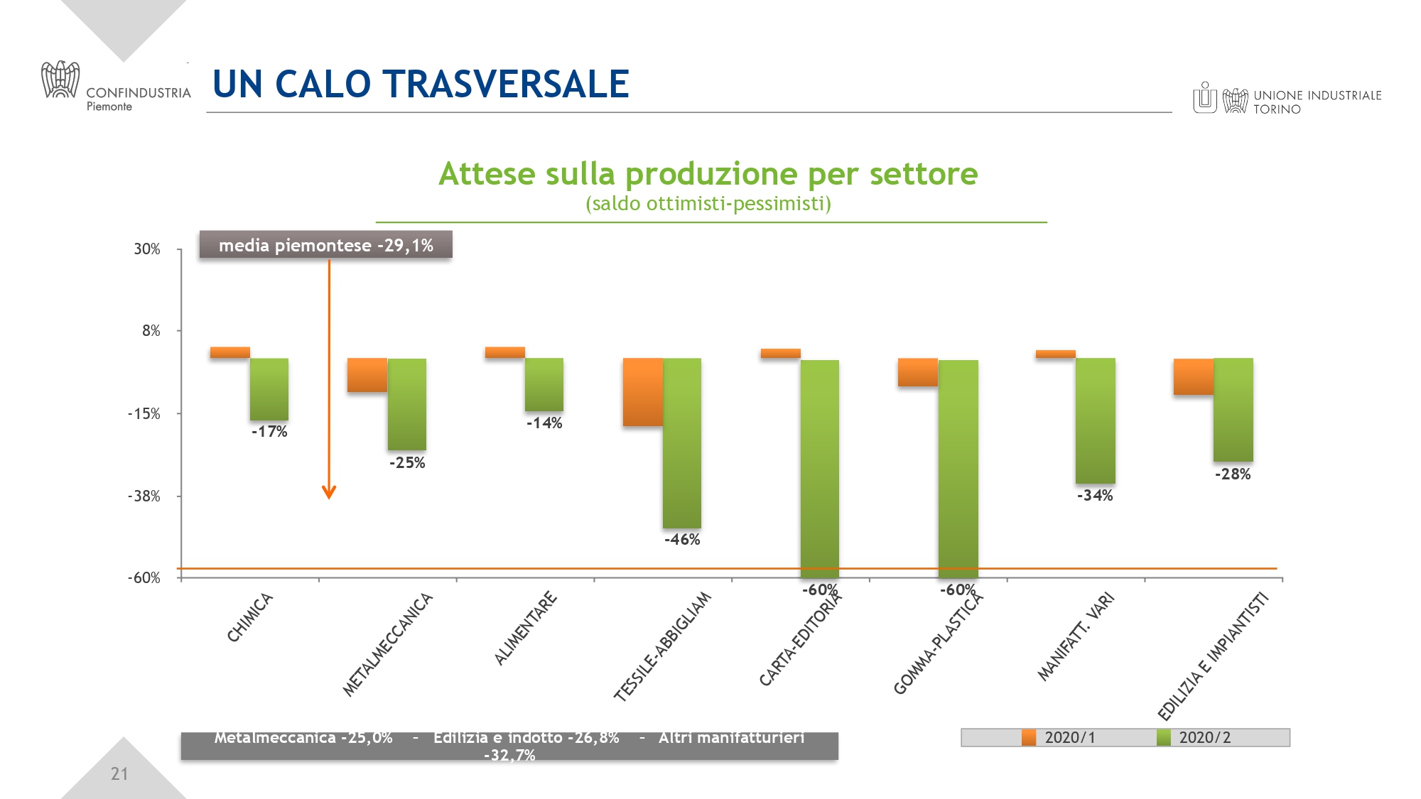 A livello settoriale la metalmeccanica è uno dei settori più colpiti dal calo produttivo dovuto alla pandemia (-25,5%); soffrono in particolare la metallurgia (-43,3%), l’industria elettrica (-36,0%), macchinari a apparecchi (-25,3%) e automotive (-20,7%).