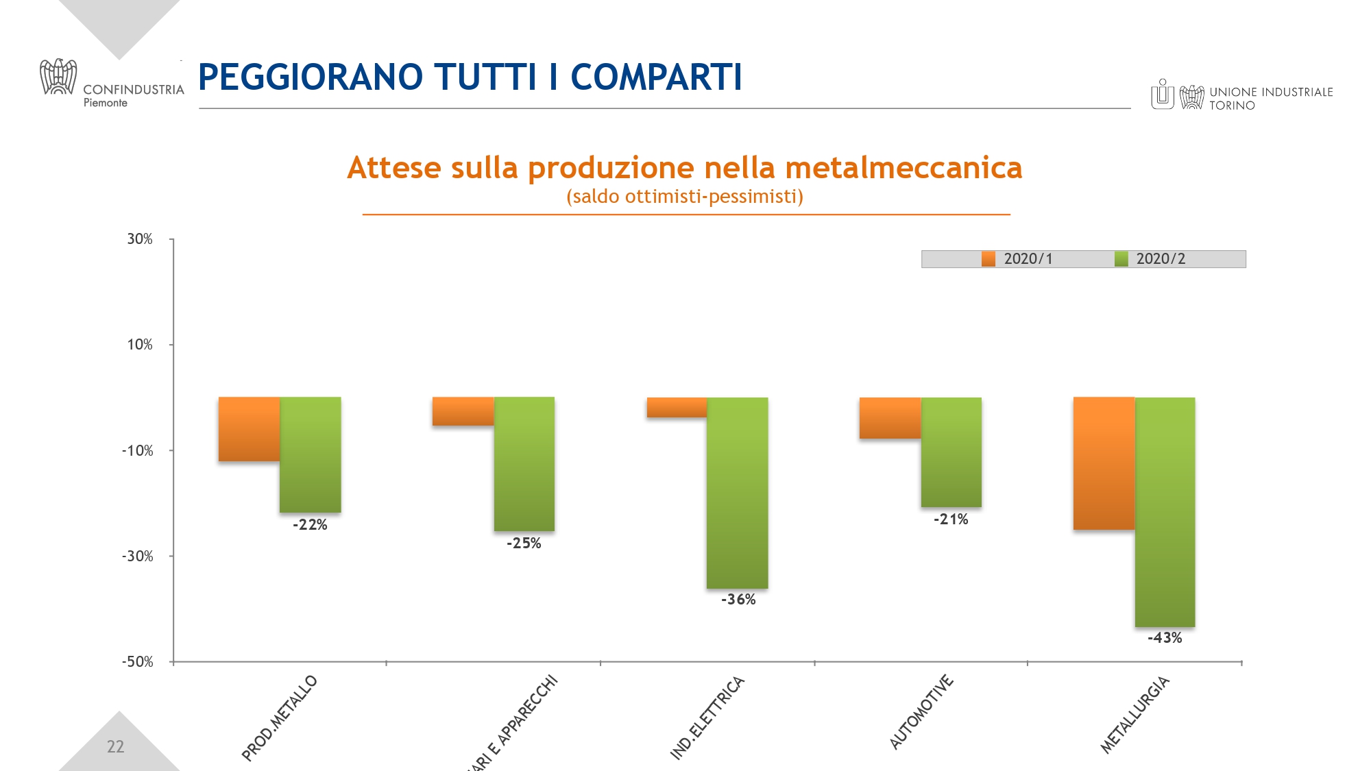 Il peggioramento degli indicatori è eloquente e generalizzato. Nel comparto manifatturiero, quasi il 45% delle imprese prevede una riduzione della produzione, contro il 10% che si attende un aumento. Il saldo (pari a -29 punti percentuali) peggiora di 22 punti.