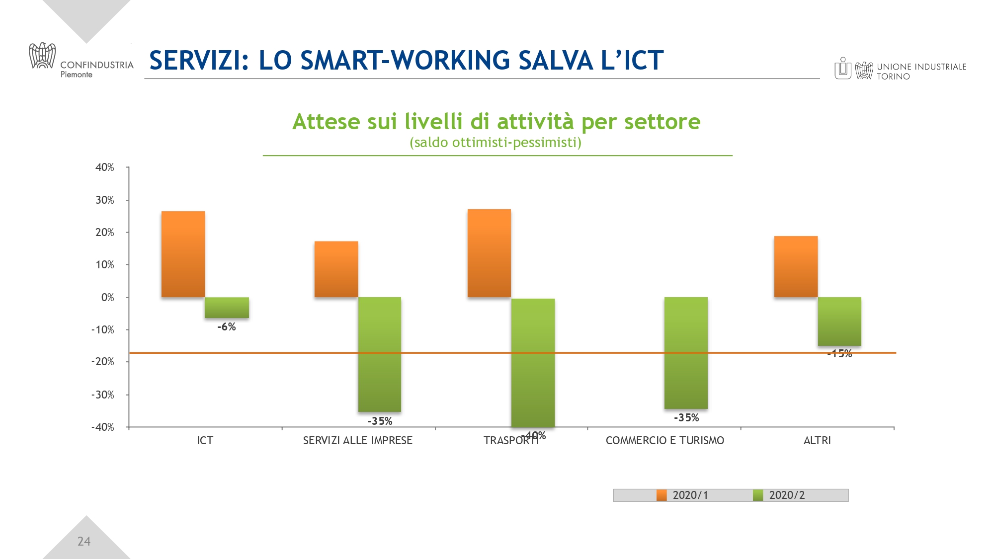 Anche il comparto dei servizi è stato coinvolto in pieno dalla crisi. Gli indicatori sono appena meno sfavorevoli di quelli del comparto manifatturiero. Tuttavia molto più marcato è il cambiamento di clima: una vera e propria doccia fredda, considerando che a gennaio il terziario operava in condizioni di mercato espansive, con attese molto positive per attività, ordinativi e occupazione. Isolata eccezione è il comparto Ict, senza dubbio per effetto dell’esponenziale aumento dello smart working.