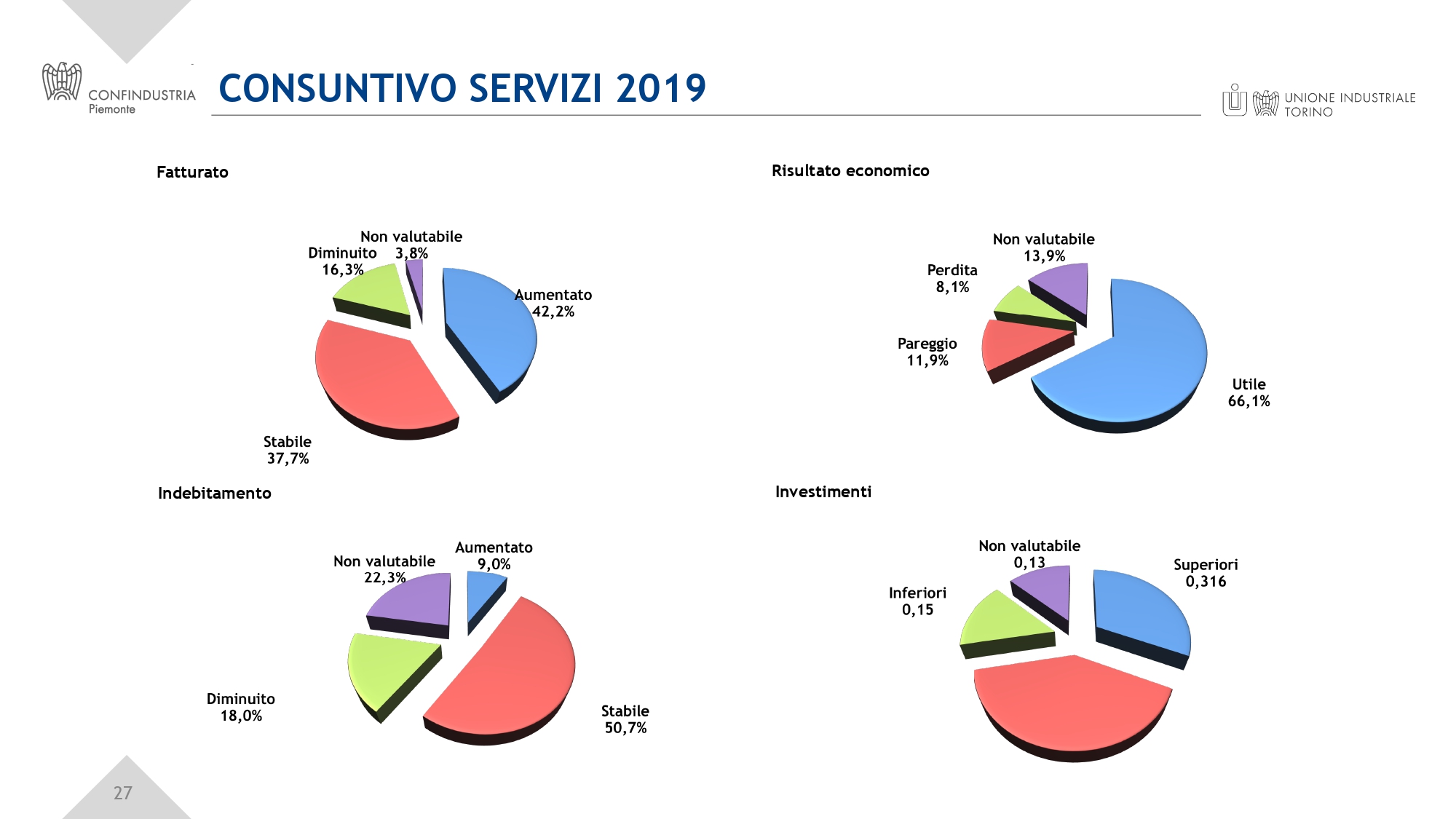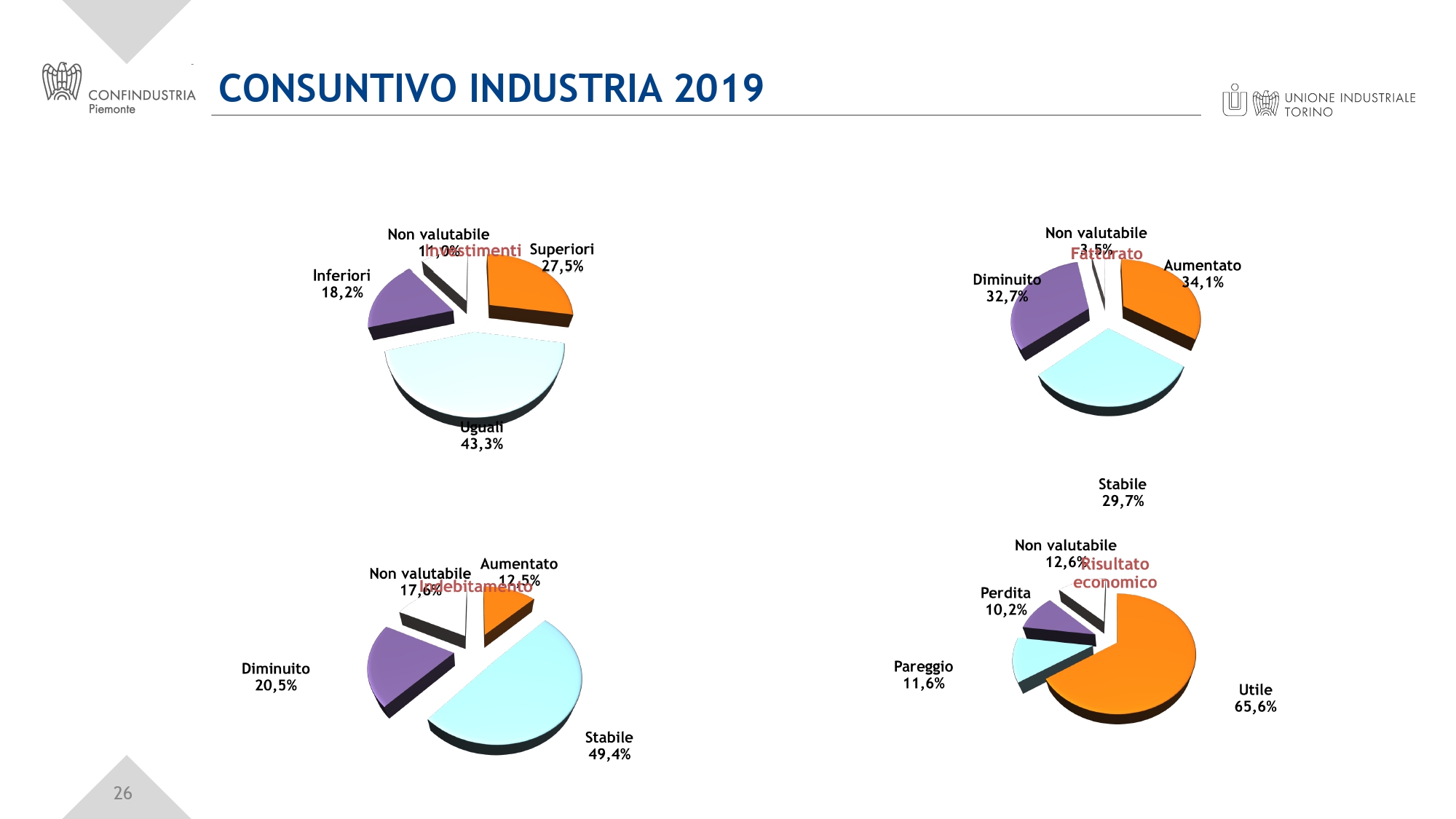 Il 42% delle imprese ha aumentato il fatturato; solo il 16% lo ha ridotto. Ottimi anche i risultati di bilancio: il 66% ha chiuso il 2019 in utile (contro l’8%). In riduzione l’indebitamento (9% di aumento contro 18%), nonostante il buon andamento degli investimenti: il 32% delle imprese ha aumentato la spesa rispetto al 2018 (contro il 15%).