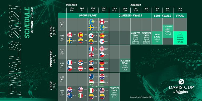 Partiranno il 25 novembre le finali di Coppa Davis che per la prima volta si disputeranno in fasi a gironi in tre sedi: Torino, Innsbruck e Madrid.