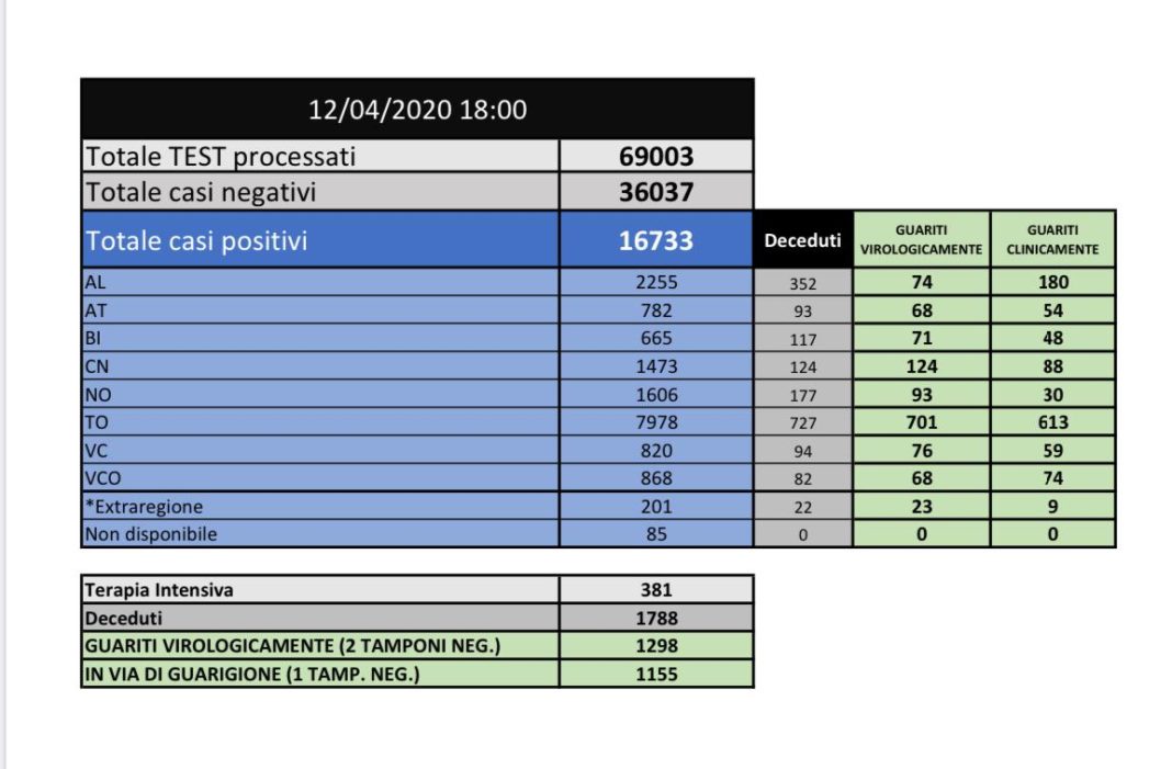 Oggi pomeriggio l’Unità di Crisi della Regione Piemonte ha comunicato che il numero complessivo di pazienti virologicamente guariti, cioè risultati negativi ai due test di verifica al termine della malattia, è di 1.298 (118 in più di ieri): 74 (+13) in provincia di Alessandria, 68 (+3) in provincia di Asti, 71 (+2) in provincia di Biella, 124 (+11) in provincia di Cuneo, 93 (+11) in provincia di Novara, 701 (+62) in provincia di Torino, 76 (+8) in provincia di Vercelli, 68 (+5) nel Verbano-Cusio-Ossola, 23 (+3) provenienti da altre regioni.