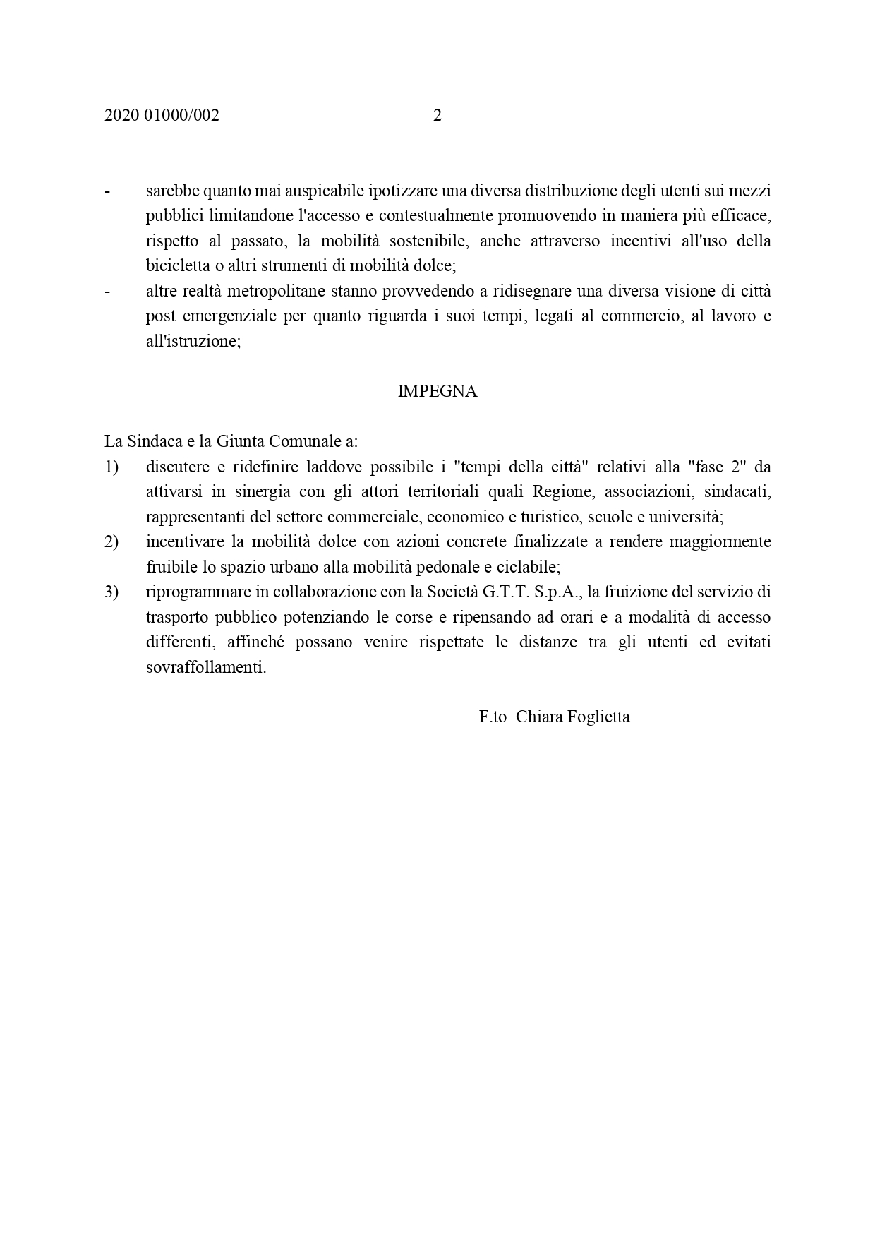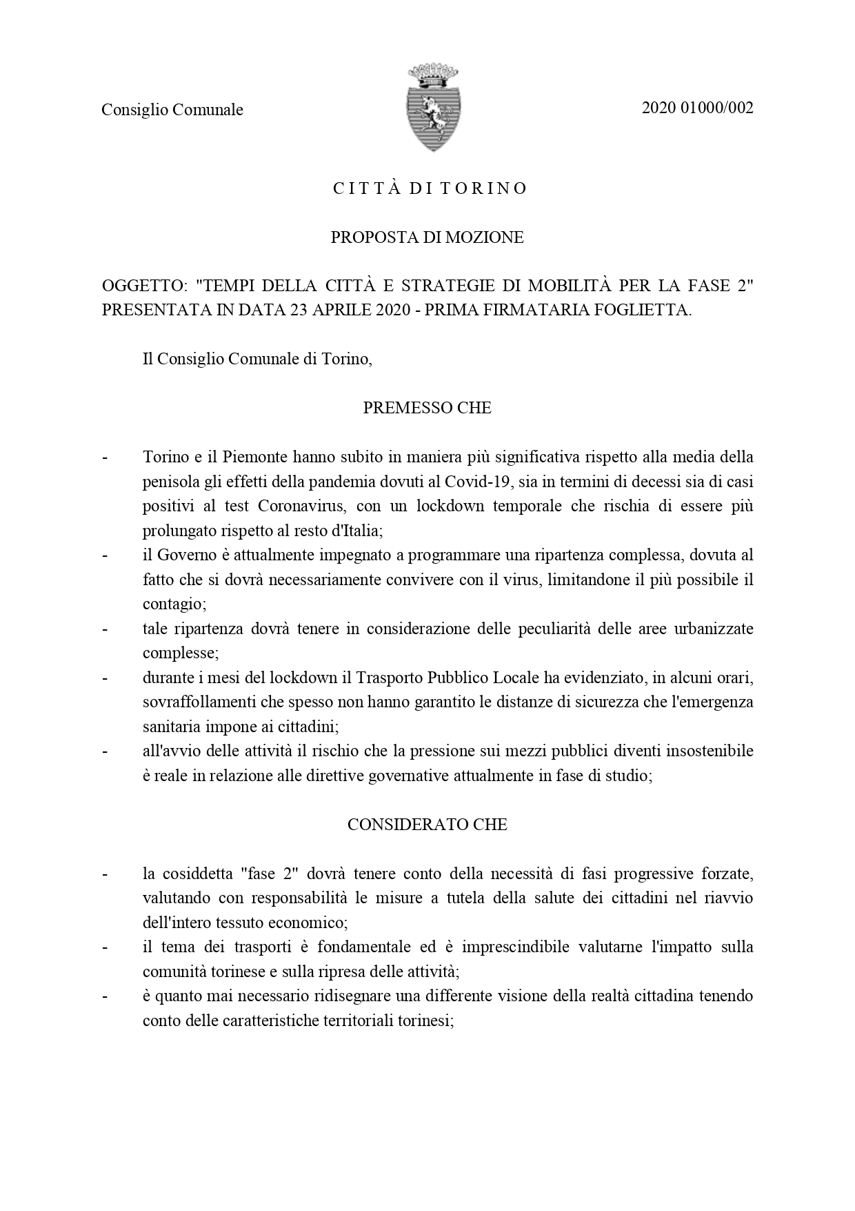 È stata presentata dalla consigliera comunale di Torino del Partito Democratico, Chiara Foglietta, una mozione che “impegna la sindaca e la giunta a discutere e definire “i tempi della Città” rispetto alla fase 2, in sinergia con Regione, associazioni, sindacati, rappresentanti del commercio, economici, turistici, le scuole e le Università”.