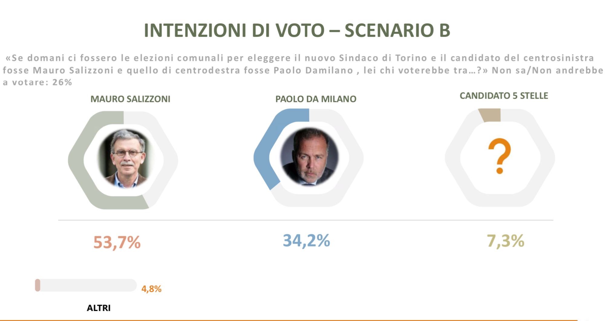 Successo confermato dalle proiezioni di voto: un possibile scontro Salizzoni – Damilano ha visto esprimersi a favore del primo il 53,7 per cento del campione contro il 34,2 per cento. Cifre che invece si riequilibrano se il candidato del centrosinistra è Lo Russo: 41,2 per centro, contro il 40,3 di Damilano.