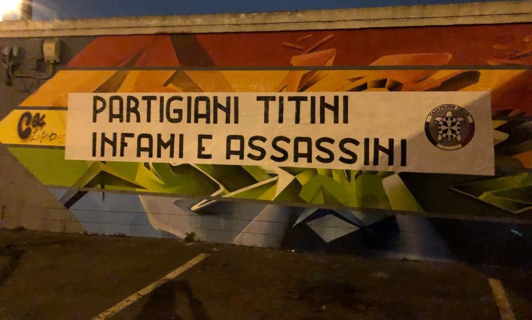 “Partigiani titini infami e assassini”, così recita lo striscione apparso a Torino e in altre città italiane in occasione del Giorno del Ricordo. La firma è di CasaPound Italia.