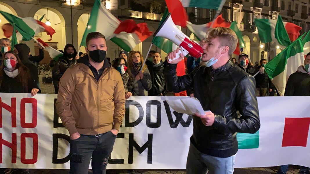 Sono un centinaio i manifestanti che si sono dati appuntamento in piazza Vittorio Veneto alle 18 per una protesta pacifica contro il Dpcm che impone chiusure anticipate a bar e ristoranti e la serrata per altre attività.