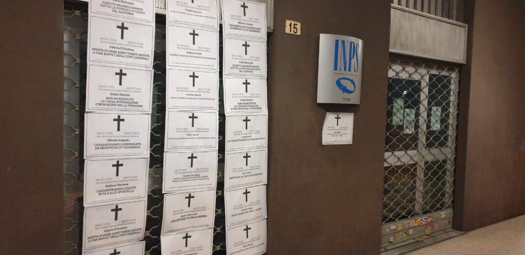Centinaia di manifesti funebri sono stati affissi dai militanti di CasaPound Italia davanti alle sedi INPS in decine di città italiane tra cui Torino, Chivasso e Ivrea.