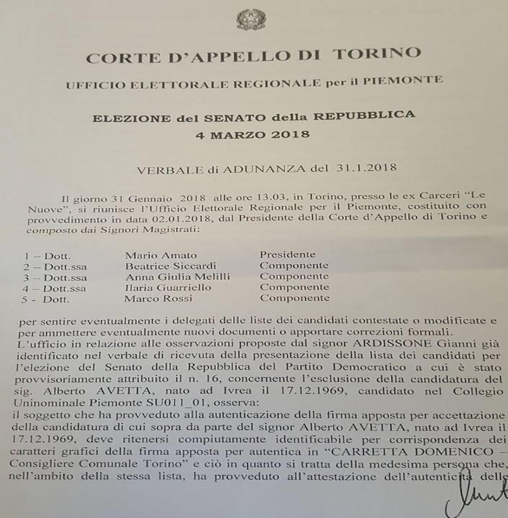Tutto risolto. Alberto Avetta resta in corsa per il Senato. L’udienza di oggi si è conclusa dando ragione al sindaco di Cossano Canavese, in provincia di Torino, la cui candidatura nelle liste del Partito Democratico era stata sospesa per un vizio di forma: la mancata specificazione della carica del funzionario che aveva compilato il modulo.