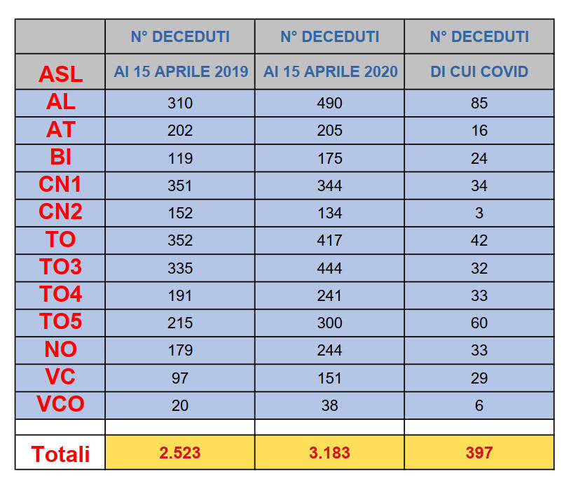 I decessi nelle RSA piemontesi, al 15 aprile 2020, sono stati 660 in più dell’analogo periodo del 2019: 397 sono risultati positivi al coronavirus.