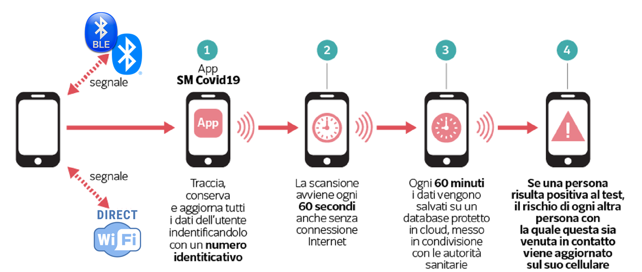 Come funziona? “Utilizzando metodi di trasmissione dei dati quali, BT-LE, BT, WiFi P2P e GPS (se abilitato dall’utente), il telefono acquisisce un ID univoco di tutti gli smartphone in prossimità (da 2 a 30 m in base al tipo di sensori disponibili sul dispositivo) e ne conserva la durata. La scansione avviene ogni 60 secondi anche con l’app in background. Ogni 60 minuti i dati aggregati vengono salvati su un database protetto messo in condivisione con le autorità sanitarie. I dati sono conservati nel database per 21 giorni e poi cancellati”.