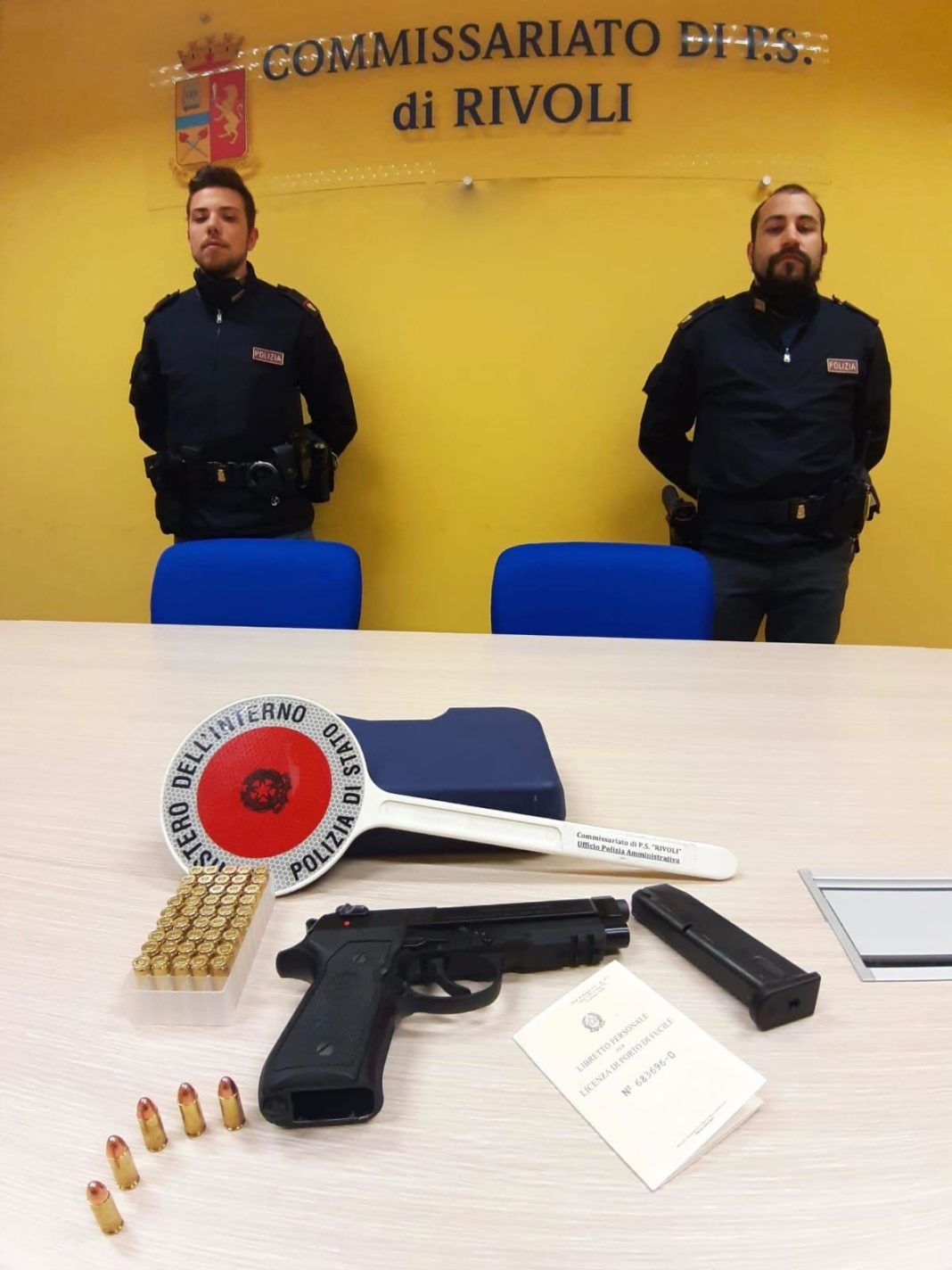 Questa volta più della paura e dell’orrore ha vinto il coraggio: la donna affida i suoi due piccoli bambini e, nel pomeriggio del 27 aprile, si reca presso il Commissariato di P.S. di Rivoli. Dopo aver mostrato la foto, scattano subito le indagini e presso uno dei domicili dove avrebbe potuto essere la pistola, ossia presso la casa dei genitori di lui, i poliziotti trovano l’arma. Come in un rebus, le armi che trovano però sono due, apparentemente simili: stesse dimensioni, stesso modello. Una però è un’arma vera, una Beretta 98, che è un’arma da guerra, e l’altra una sua copia.