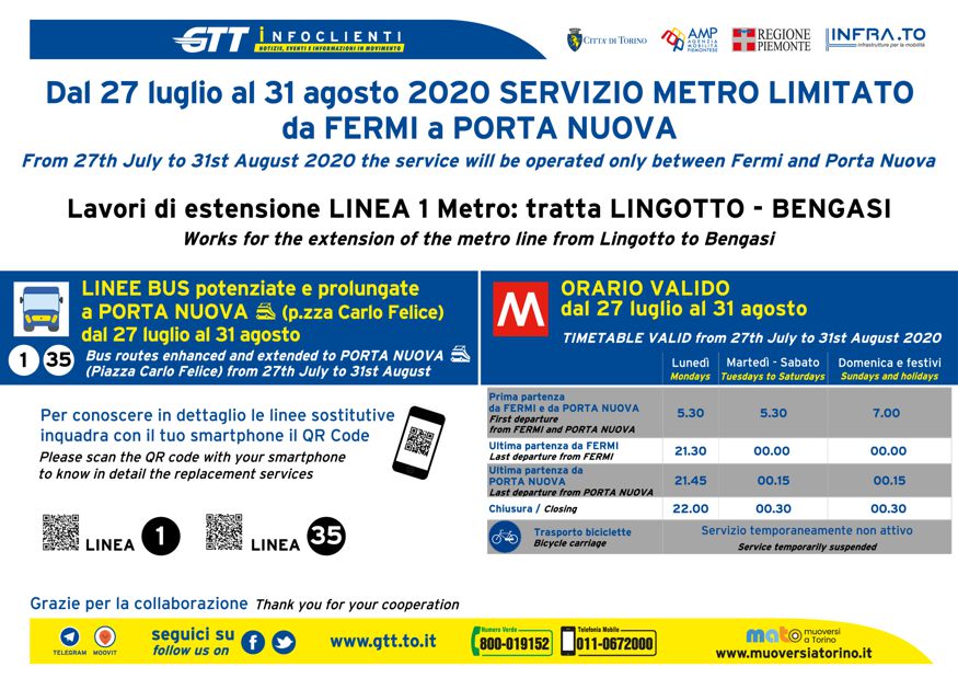 Inoltre, nella tratta Lingotto – Porta Nuova, in sostituzione della Metropolitana, sarà possibile viaggiare con le linee bus 1 e 35 che saranno prolungate a Porta Nuova per consentire ai passeggeri l’interscambio con la metro.